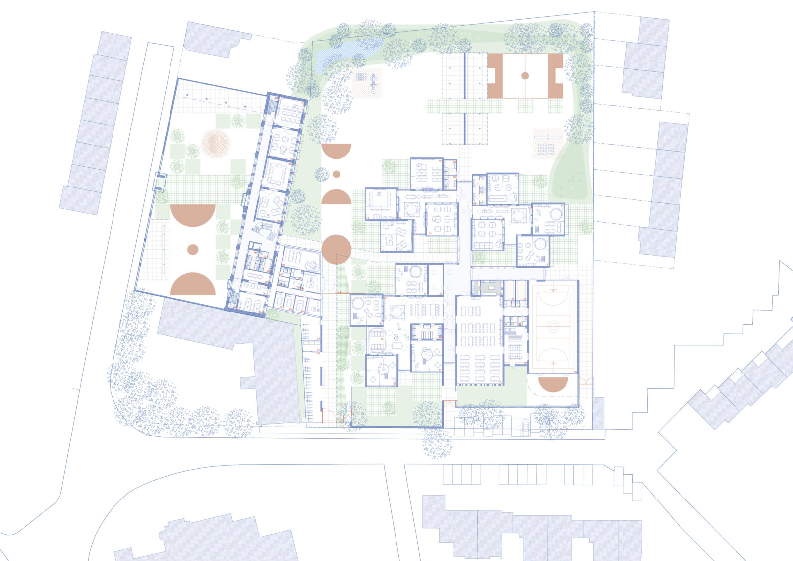 LAVA koos ervoor om beide gebouwen maximaal te behouden en te integreren. Hun ruimtelijke generositeit, architecturale kwaliteit en duurzame materialiteit boden een sterke basis voor een toekomstgerichte school. Met een duidelijke programmatische hiërarchie, zorgvuldige fasering en respectvolle ingrepen werd een hedendaags leerlandschap gecreëerd dat tegelijk vertrouwd en vernieuwend aanvoelde.